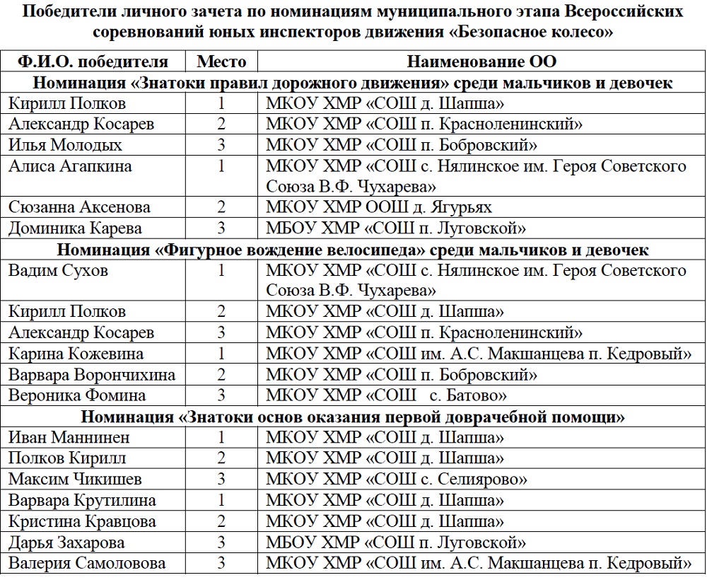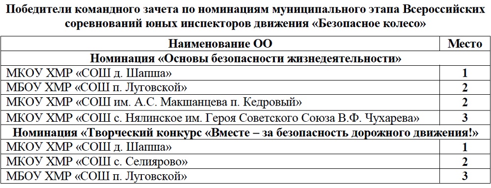 Все участники были награждены сертификатами, грамотами, дипломами, кубками, а команда-победительница под руководством педагога дополнительного образования Александра Абрамова получила почетное право представлять Ханты-Мансийский район на окружных соревнованиях среди юных инспекторов движения «Безопасное колесо – 2020».