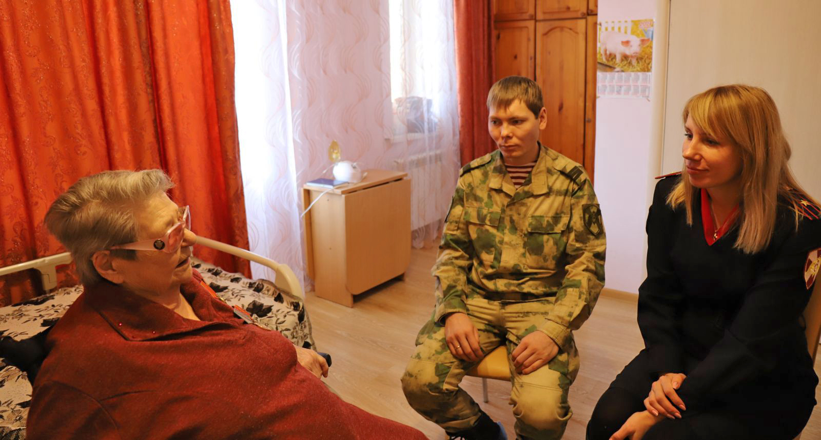 92-летняя Елизавета Фомина живет в Ханты-Мансийском районном доме-интернате для престарелых и инвалидов в деревне Шапша. В гости к ней росгвардейцы, одни из главных партнеров муниципального проекта Ханты-Мансийского района «Герои прошлого и настоящего», пришли вместе с заместителем директора комитета по культуре, спорту и социальной политике Наталией Беспаловой.
