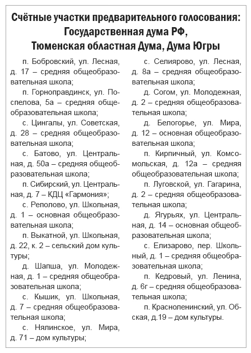 Напомним, что 19 сентября, в единый день голосования, пройдут выборы депутатов Государственной думы РФ, парламентов Югры и Тюменской области, а также представительных органов муниципальных образований, в том числе Думы Ханты-Мансийского района.