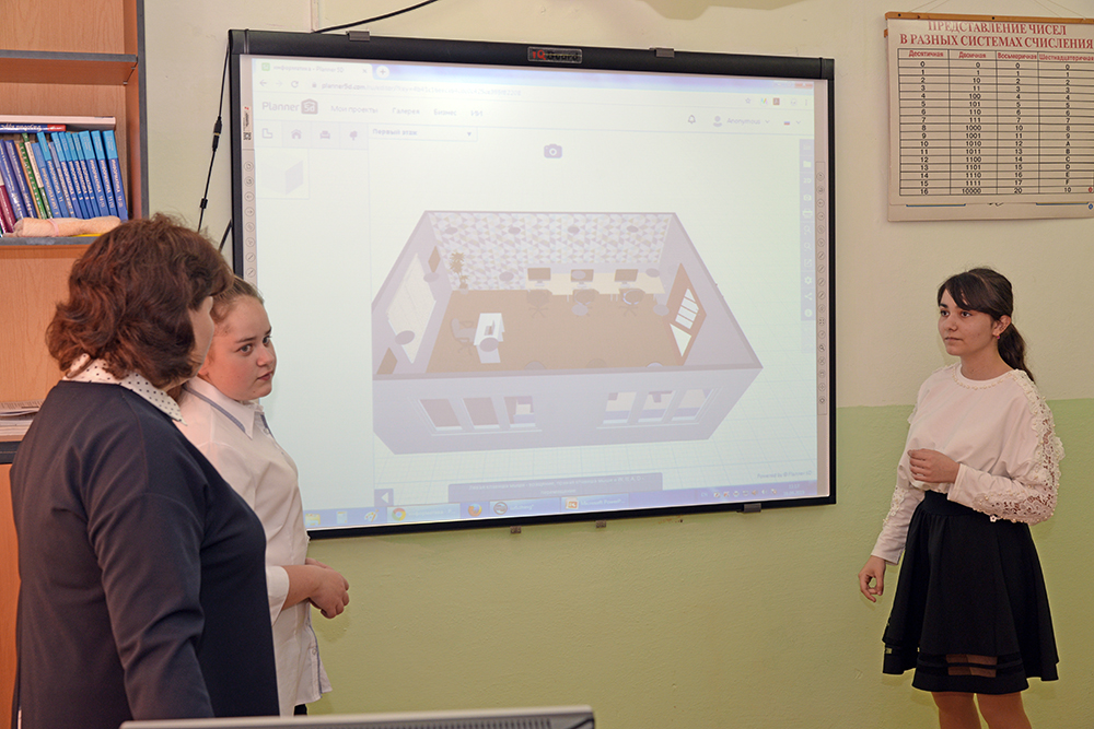 Дизайнеры помещений Карина Аскерова и Алина Борисова, используя программу Planner 5D, представили дизайн будущих помещений – интерьер классов, коридоров, школьной столовой. В отделе, где изучаются естественные науки, предлагается разместить зимние сады. А для перемещения с верхних этажей на первый этаж возможно использование горки. Помимо этого, ребята предложили использовать более яркую цветовую гамму при обустройстве внутренних помещений.