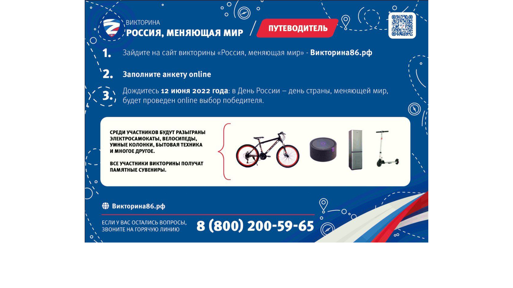 Для этого нужно зайти на портал викторина86.рф, ответить на предложенные вопросы и заполнить анкету участника. Розыгрыш ценных призов состоится 12 июня в День России. Победителей определит генератор случайных чисел.