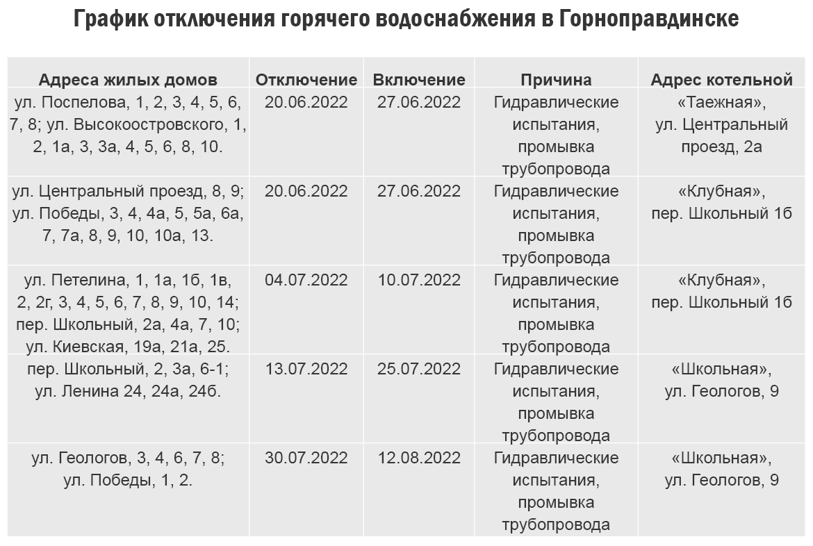 По состоянию на сегодняшний день выполняются демонтажные работы (в том числе демонтаж котельного оборудования). В целях обеспечения бесперебойного предоставления коммунальной услуги населению выполнены работы по укладке временного трубопровода горячего водоснабжения всем потребителям коммунальной услуги. Учитывая технологический процесс по капитальному ремонту котельных и промывке сетей тепло- и водоснабжения, возможны кратковременные перебои в подаче горячего водоснабжения.