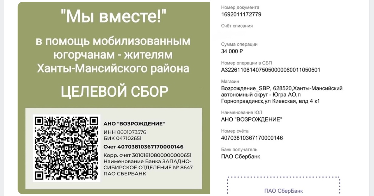 От инициативной группы "Мы с вами" сельского поселения Шапша на счёт районного благотворительного сбора поступили денежные средства в размере 34000 рублей.