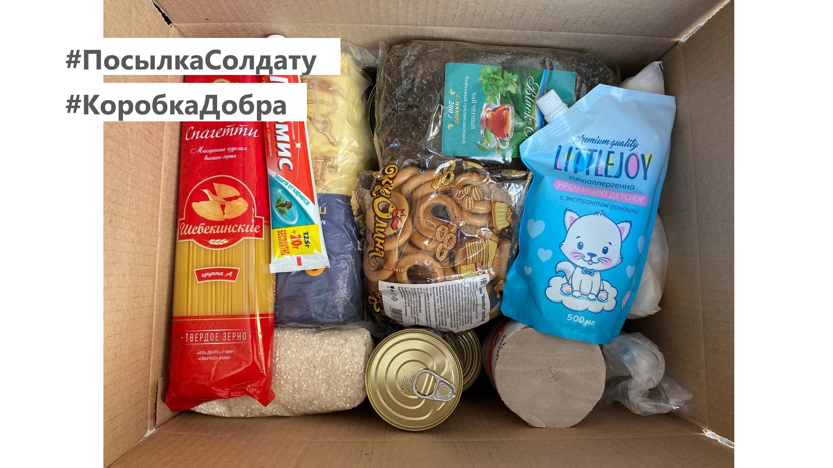 Напомним, работа по формированию "Коробок добра" и "Посылок солдатам" ведется ежемесячно, в состав посылок входят продукты длительного хранения, средства личной гигиены, вещи.