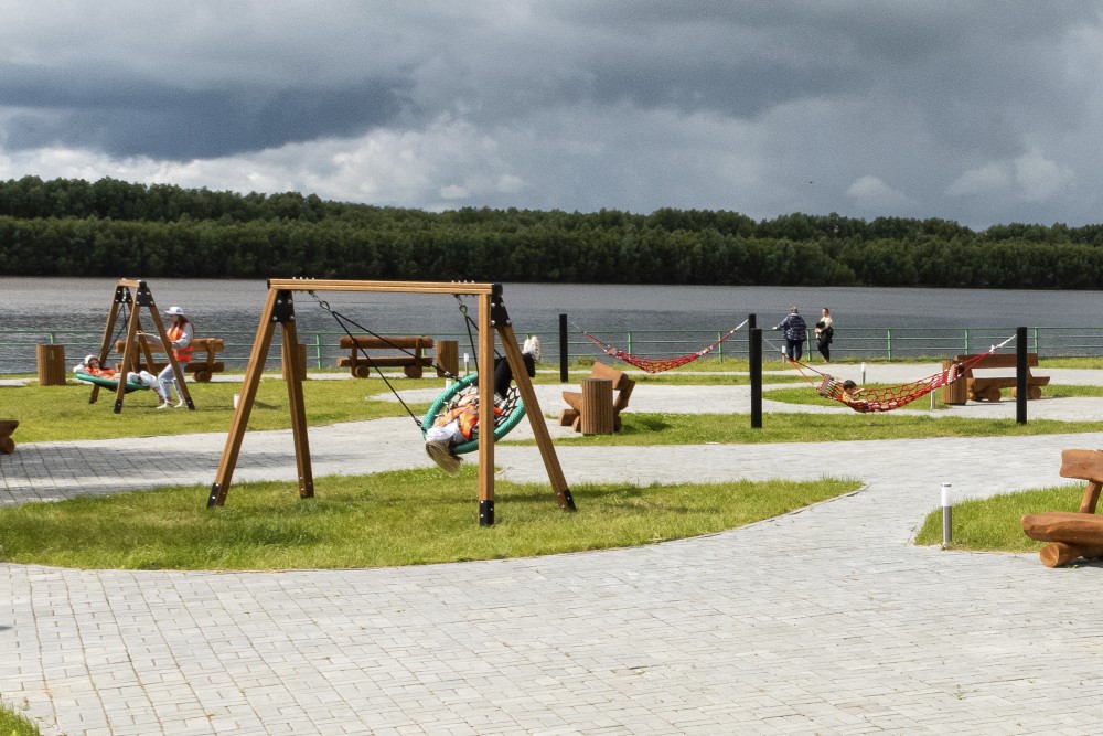 Новое общественное пространство позволяет организовать досуг для жителей любого возраста: на набережной есть подвесные качели, гамаки, 14 скамеек с урнами, вблизи от берега оборудованы три мангальные зоны. Кроме того, обустроена сцена для культурно-массовых мероприятий, подведено электричество для подключения оборудования. Для освещения парковой зоны в вечернее время установлено современное светотехническое оборудование – наземные светодиодные фонари. Приняты меры против вандалов – набережная будет находиться под наблюдением системы видеоконтроля.