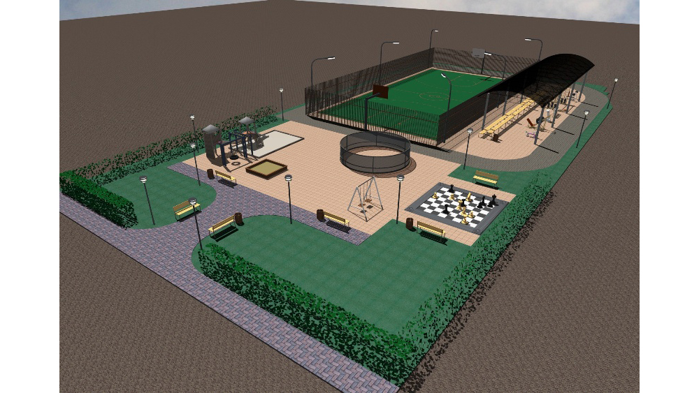 Далее запланировано обустроить тротуар из бетонных плит, уложить мягкое покрытие, установить ограждение, баскетбольную площадку, тренажеры и другие элементы спортивной инфраструктуры, шахматную доску, игровой комплекс, качели и песочницу, разбить газон.