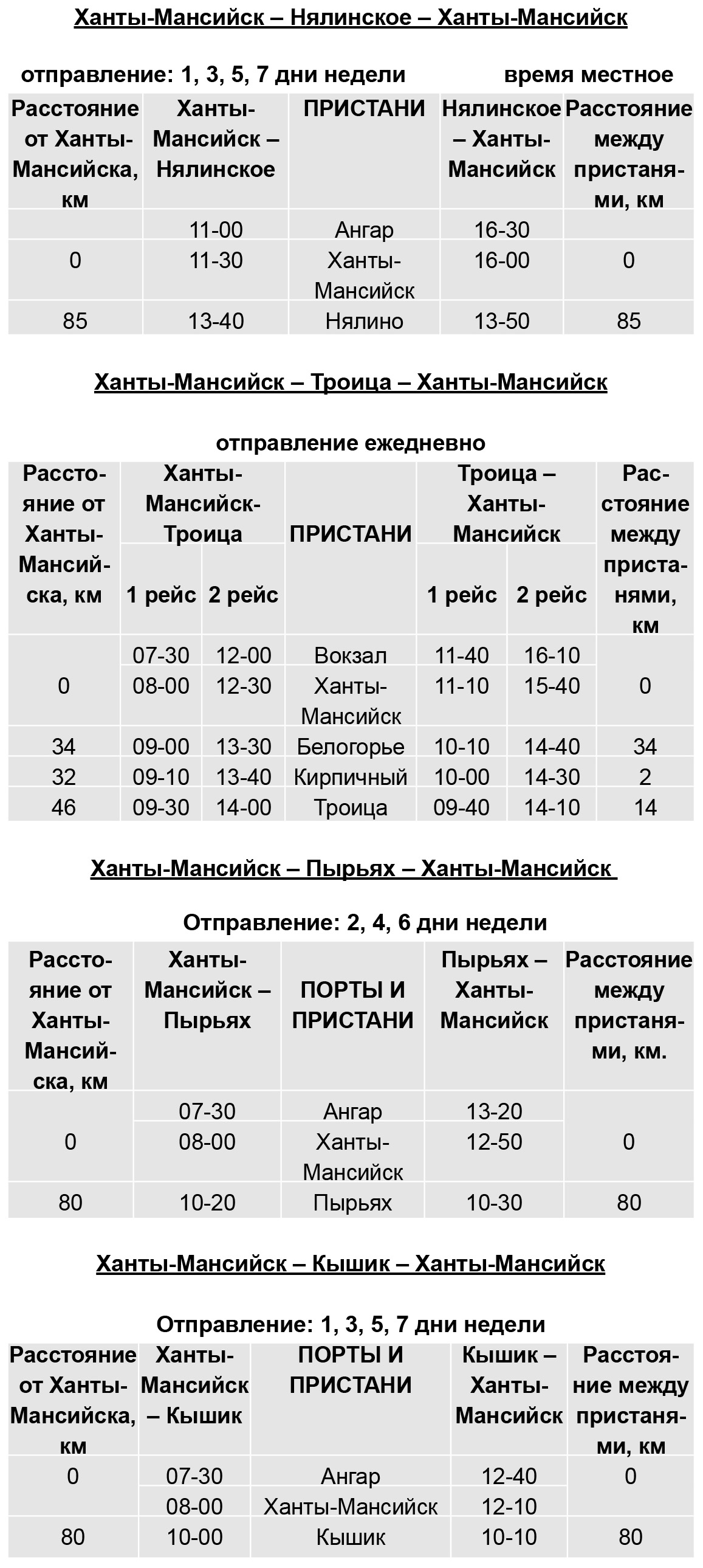 Расписание движения пассажирских теплоходов на Нялинское, Троицу, Пырьях и Кышик в межнавигационный период 2019 года.