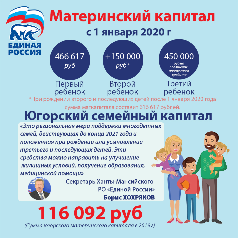 «Напомню, в автономном округе существует Югорский семейный капитал – это региональная мера поддержки многодетных семей, действующая до конца 2021 года и положенная при рождении или усыновлении третьего и последующих детей. Эти средства можно направить на улучшение жилищных условий, получение образования, медицинской помощи. Сумма югорского семейного капитала в 2019 году составляла 116 092 рубля. На ближайшем заседании Думы Югры мы планируем рассмотреть вопросы, связанные с изменением нашей региональной меры поддержки для многодетных семей, в том числе и в отношении продлении срока его выплаты», - подчеркнул Секретарь Ханты-Мансийского регионального отделения Партии, спикер окружного парламента Борис Хохряков.