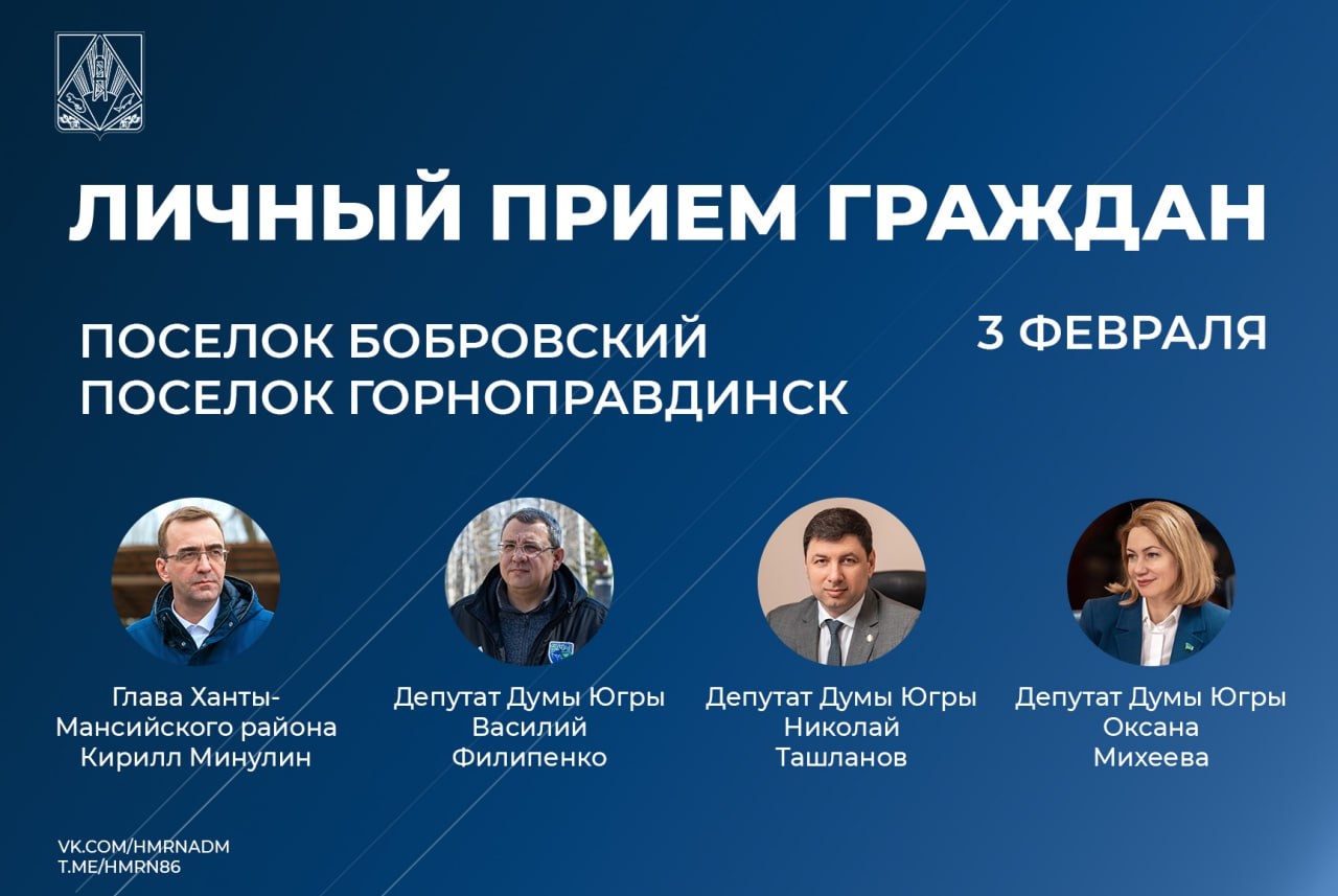 3 февраля 2026 года в двух населенных пунктах Ханты-Мансийского района пройдет масштабный день приема граждан, в ходе которого жители смогут напрямую обратиться за помощью и разъяснениями к руководству муниципалитета и окружным депутатам. Глава района, секретарь местного отделения партии «Единая Россия» Кирилл Минулин проведет личный прием по различным вопросам в поселках Бобровский и Горноправдинск.
