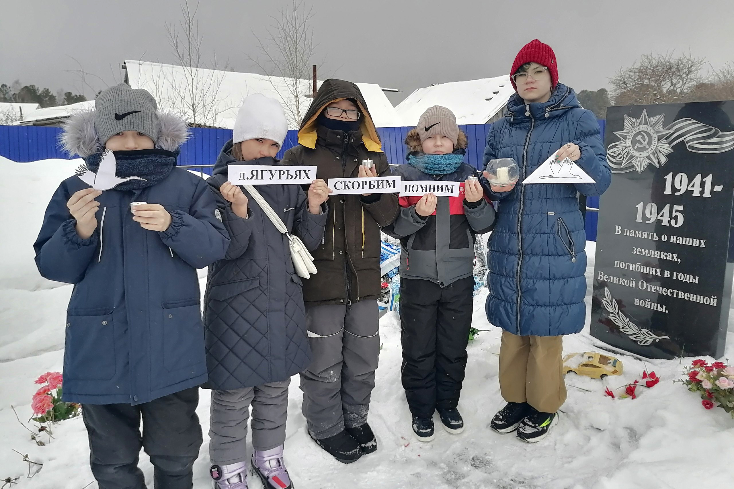 Сельчане несут к мемориалам свечи, цветы и детские игрушки.