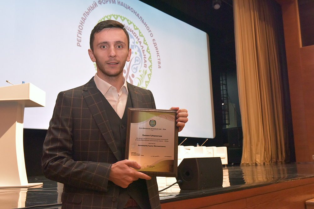 В рамках форума состоялась церемония вручения премии губернатора Югры в целях поощрения и поддержки талантливой молодежи. В этом году награды в номинации «За вклад в развитие межэтнических отношений в Ханты-Мансийском автономном округе – Югре» удостоился представитель Ханты-Мансийского района Адам Актимиров. Адам является инициатором реализации проектов, направленных на гармонизацию межнациональных отношений в Ханты-Мансийском районе.