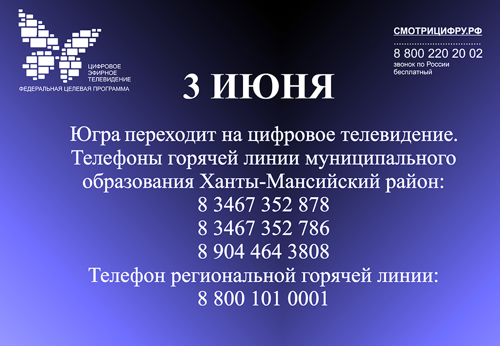 В Югре возведено 80 объектов телерадиосети, которые обеспечат цифровым телевидением 99,6% югорчан. 3 июня в округе отключат 201 аналоговый передатчик. Весь день на экранах телевизоров будут транслироваться информационные ролики и контакты горячих линий. Полное отключение займет несколько дней.