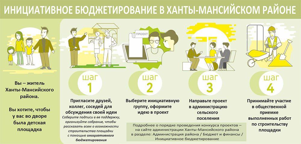 Подробно с порядком проведения конкурсного отбора проектов инициативного бюджетирования можно ознакомиться в постановлении администрации Ханты-Мансийского района от 05.02.2018 № 47 «О конкурсном отборе проектов инициативного бюджетирования в Ханты-Мансийском районе» (в редакции постановления № 34 от 31.01.2019 г.), размещенном на сайте hmrn.ru.
