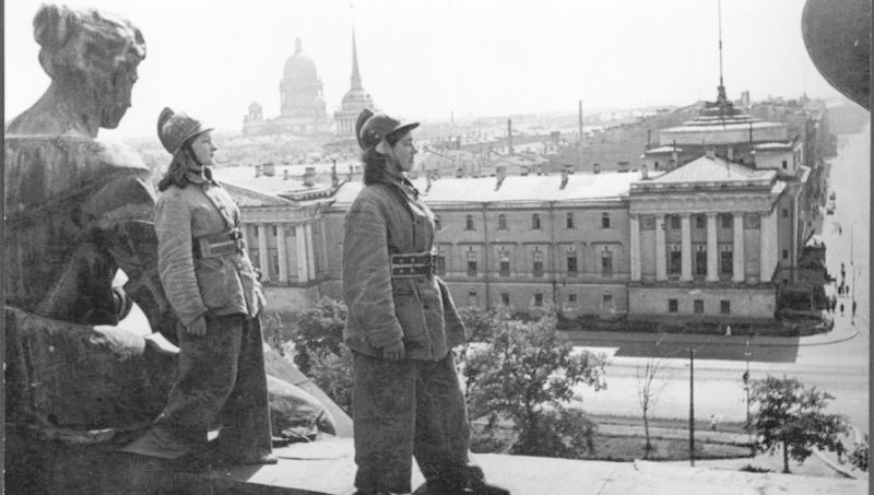 Девушки-бойцы противопожарного полка на крыше Зимнего дворца