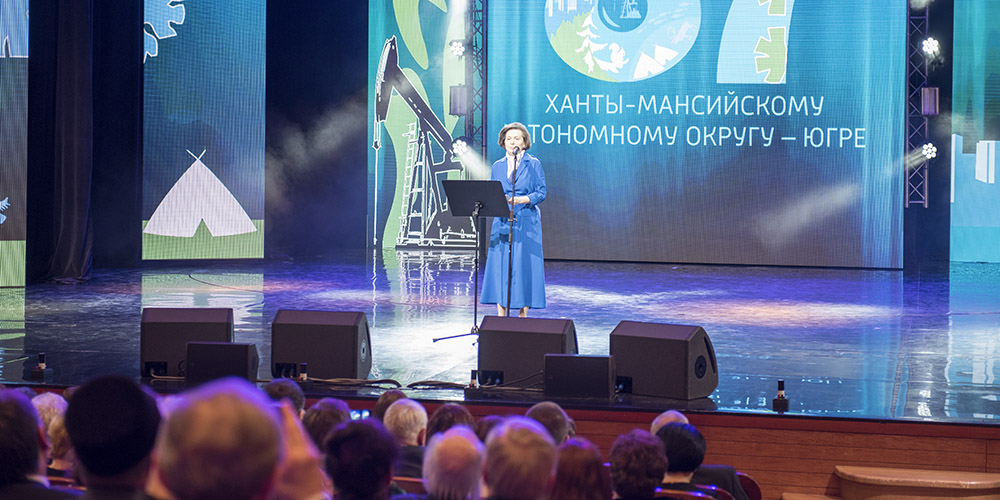 «87 лет назад на древней земле ханты, манси появился регион с неповторимым самобытным, многонациональным колоритом. С годами многовековая история Югры пополнялась новыми значимыми событиями. При этом наша генетическая связь с традициями, наше единство культур становится прочнее. Монолитными звеньями цепи успехов Югры стали достижения югорчан, любовь к родной земле. Опираясь на первопроходцев, основателей городов, потенциал молодых людей, мы работаем на перспективу, сохраняя достигнутое, строя новые планы», – обратилась со сцены Наталья Комарова.